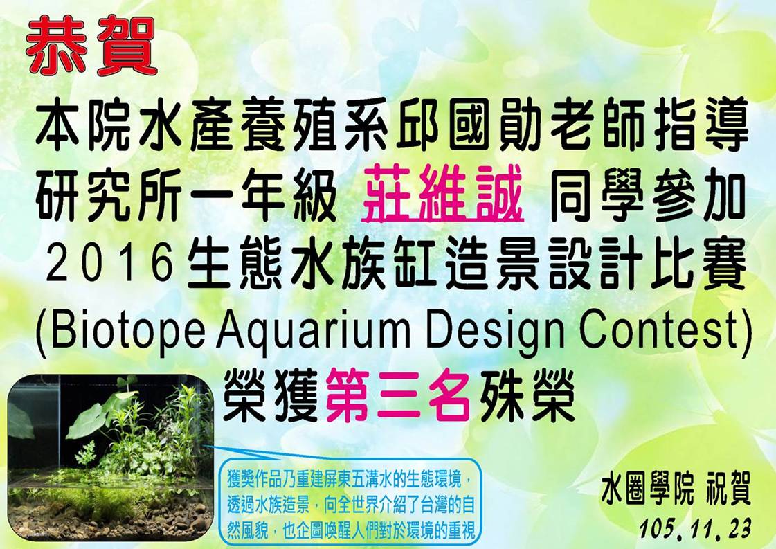 恭賀本院水產養殖系邱國勛老師指導研究所一年級莊維誠同學,榮獲2016「生態水族缸造景設計比賽(Biotope Aquarium Design Contest)」第三名!本項比賽自2011舉辦至今已6屆,為全世界最受矚目的以生態為主的水族造景比賽。